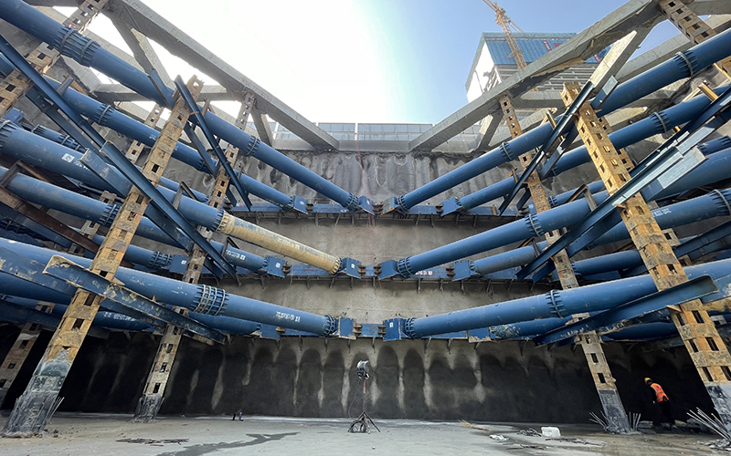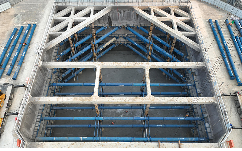 雙層段基坑深度17m,縱向長度32m,橫向長度33.8m。深基坑作業危險因素眾多,為保障基坑安全開挖,項目在開挖前進行多次模擬推演,預估風險源并不斷優化施工方案。開挖過程中遵循時空效應,采取“先撐后挖、水平分段、豎向分層”原則,做到“分層、分步、對稱、平衡、限時”五個要點,雙層下穿段土方量1.9萬m3,經過連續作業4月16日完成基坑開挖并通過五方責任主體單位基坑驗槽,4月19日完成墊層混凝土澆筑。