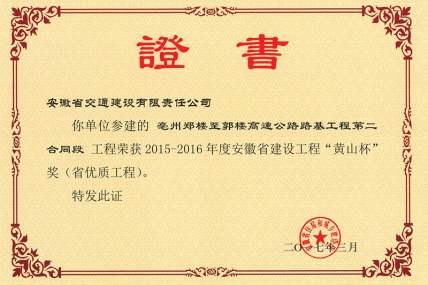 日前, 2015-2016年度省建設(shè)工程“黃山杯”獎項評選結(jié)果揭曉,由安徽省交通建設(shè)股份有限公司(以下簡稱安徽交建)施工建設(shè)的亳州鄭樓至郭樓高速公路路基工程第二...